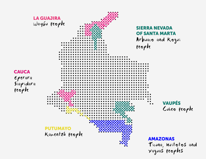 The Wayuu in La Guajira The Ahuaco and Kogui in Sierra Nevada of Santa Marta The Kamentza in Putumayo The Eperara Siapidara in Cauca The Cubeo, Ticuna, Huitotos, and Yaguas in Amazonas